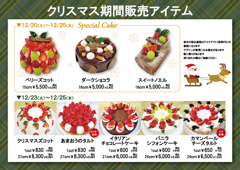 税込価格表示はテイクアウト(軽減税率8%)の価格です。店内飲食の場合は税率が異なりますので(10%)別価格となります。