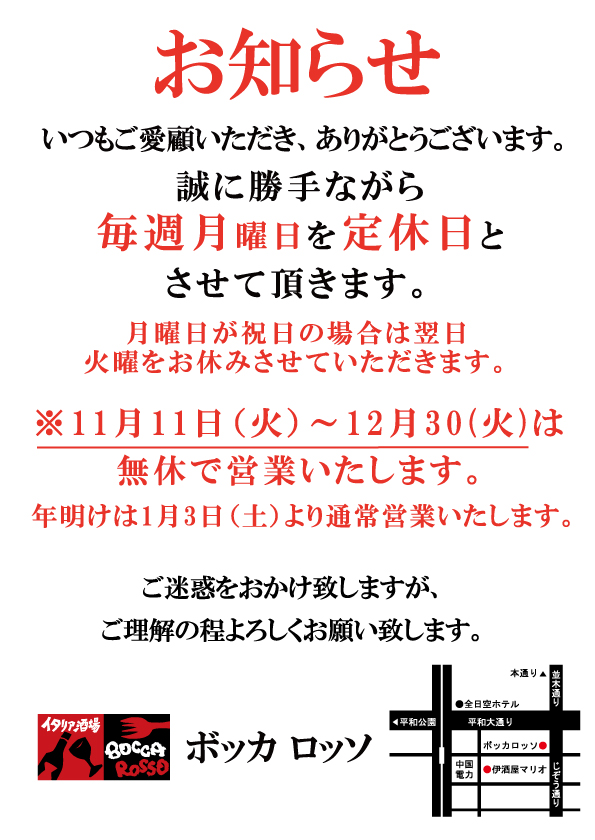 | 定休日 | 毎週月曜日 ※月曜日が祝日の場合、火曜を定休日とさせていただきます |