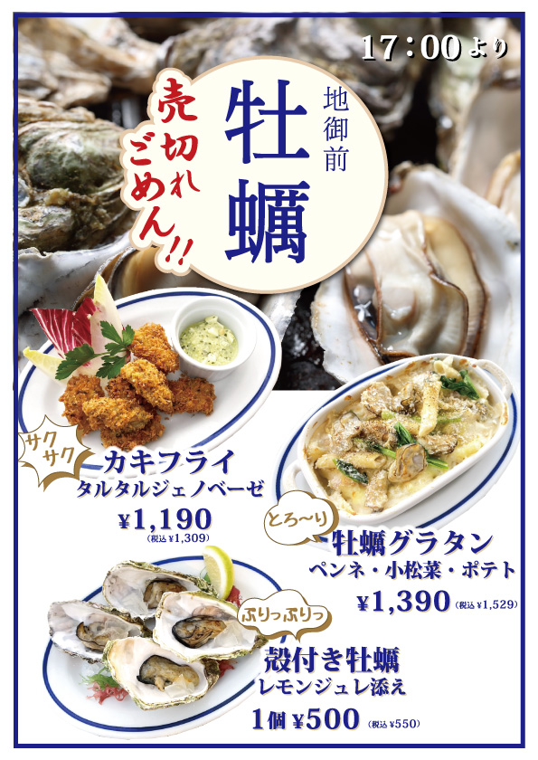 | 殻付き牡蠣 レモンジュレ添え 1個¥500(税込¥550) |