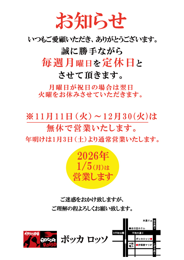 | 定休日 | 毎週月曜日 ※月曜日が祝日の場合、火曜を定休日とさせていただきます |