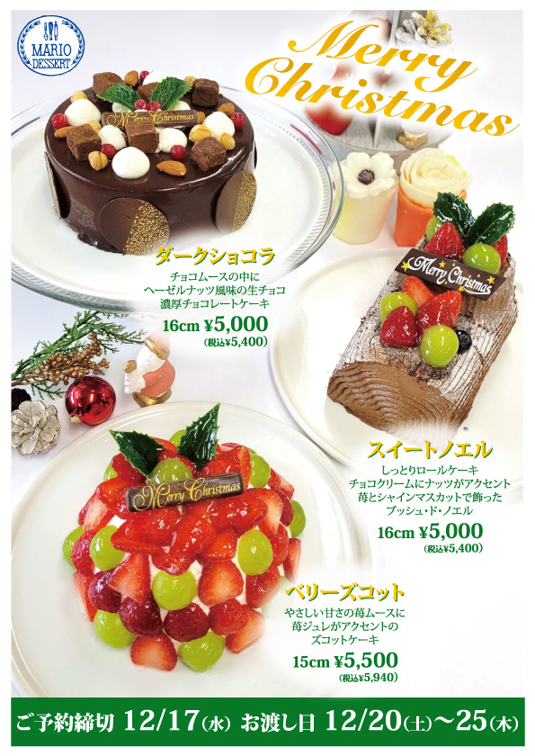 ご予約受付はマリオデザート各店にて12/17(水)までとなっております。ぜひお早めにご予約くださいませ♪