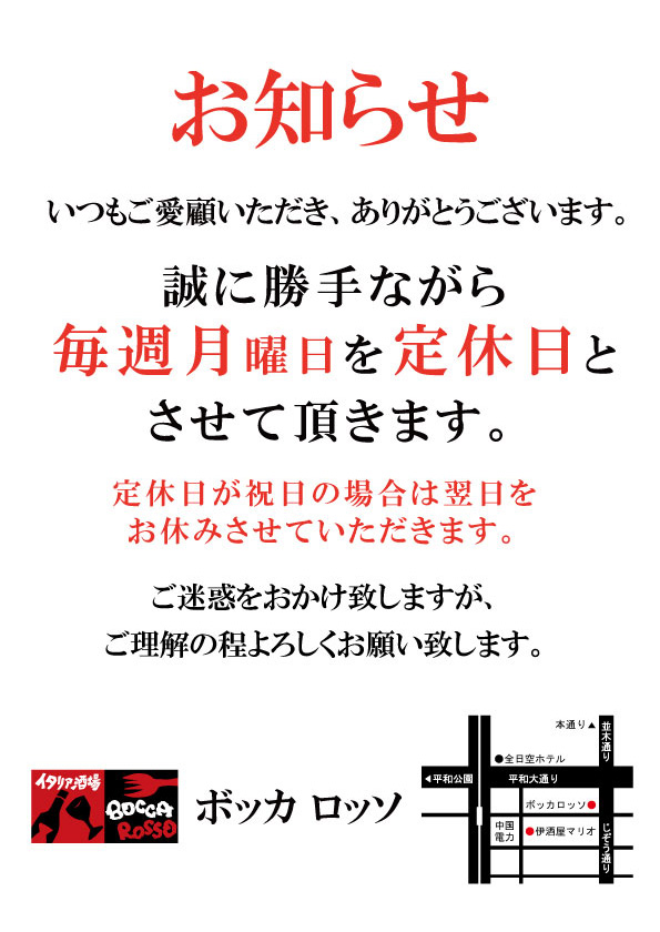 | 定休日 | 毎週月曜日 ※月曜日が祝日の場合、火曜を定休日とさせていただきます |